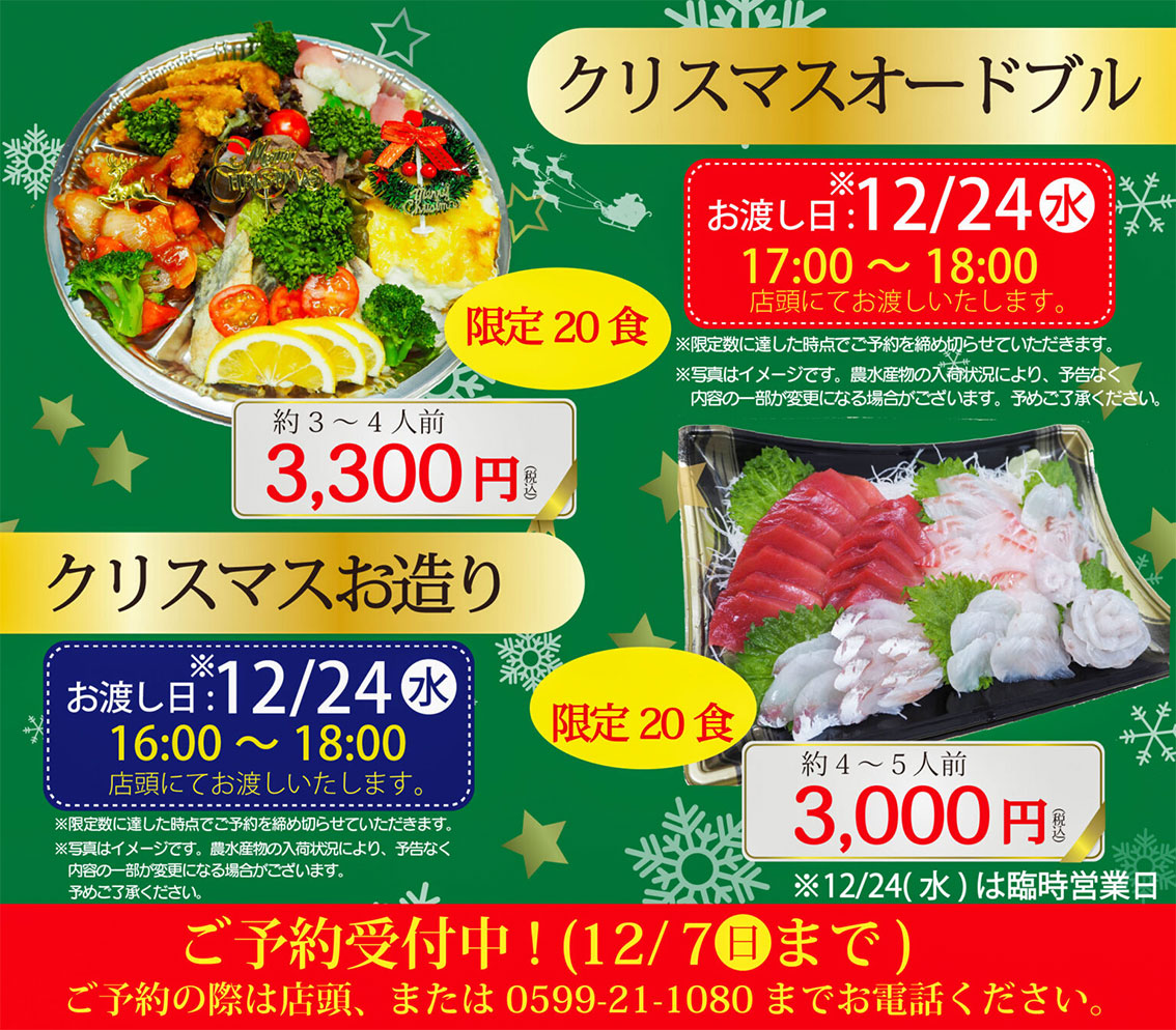 ◆「クリスマスオードブル・お造り」・「鳥羽の恵みおせち」の予約注文受付中!締切は12月7日(日)となっております❗❗ ご注文はお早めに!