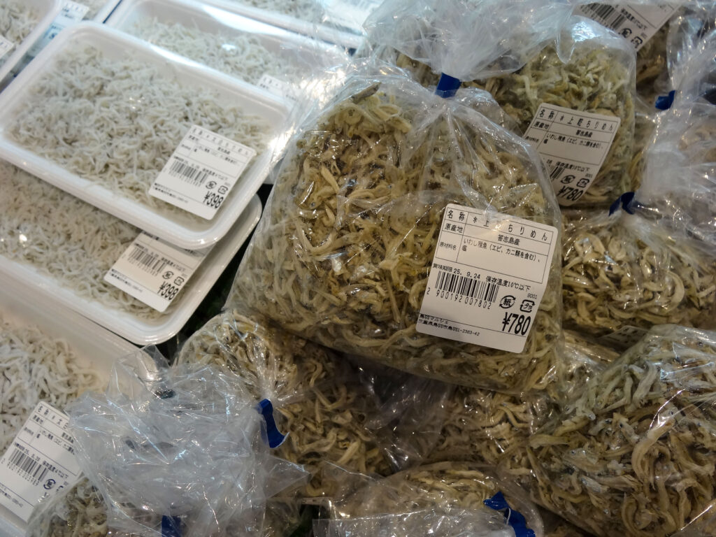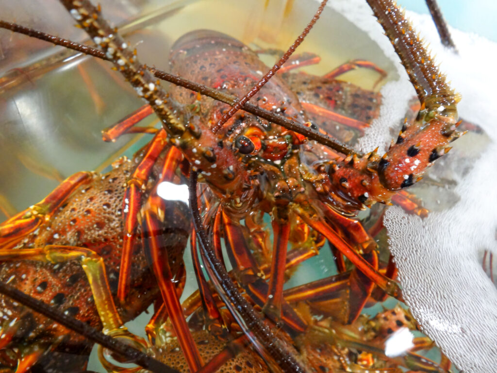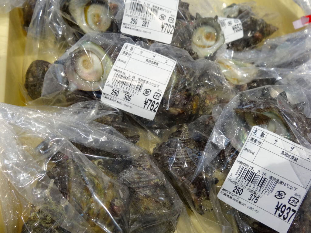 鮮魚コーナーでは、活伊勢海老、あじやマダイなどのお買い得な袋入りのお魚、サザエ、ちりめん、トロさわらなどのサク、お造りなどを販売中🦐🐟