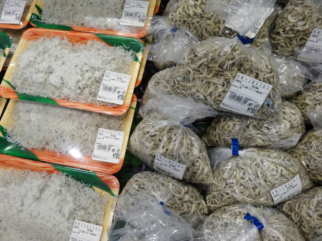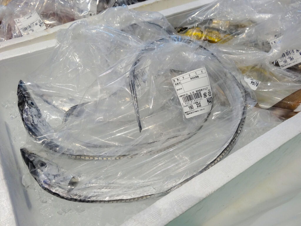 鮮魚コーナーでは、タチウオやハギなどのお買い得な袋入りのお魚、サザエ、ちりめん、サク、お造りなどを販売しております🐟