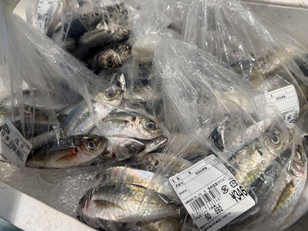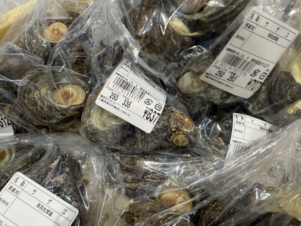 鮮魚コーナーでは、ほかにも活伊勢海老や袋入りのお魚、サザエ、ちりめん、サク、お造り、伊勢まぐろの心臓などを販売中🦐🐟