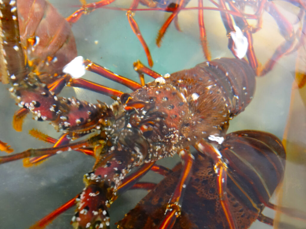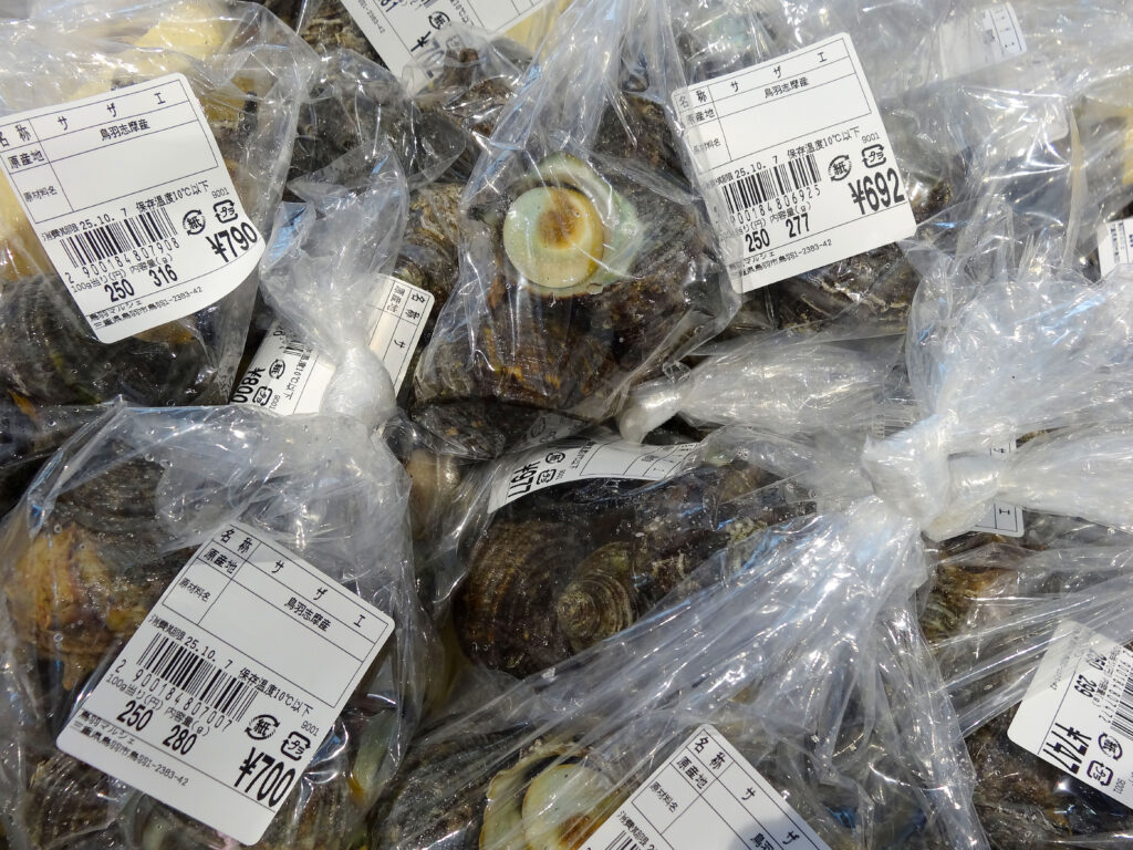 鮮魚コーナーでは、活伊勢海老、キスなどのお買得な袋入りのお魚、サザエにサク、ちりめん、お造り、伊勢まぐろの胃袋や心臓などの希少部位を販売中🦐🐟