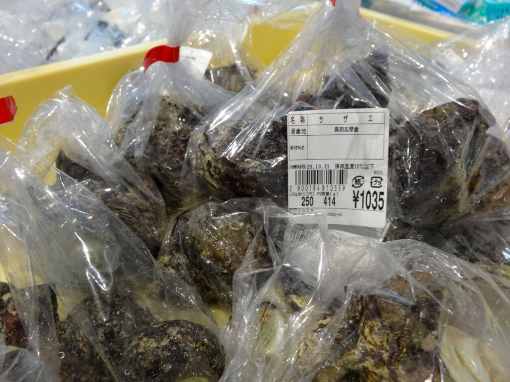 鮮魚コーナーでは、お造りや活伊勢海老、サザエ、お買い得な袋入りのお魚に、サク、ちりめん、パック詰めのお魚などを販売中🐟🦐