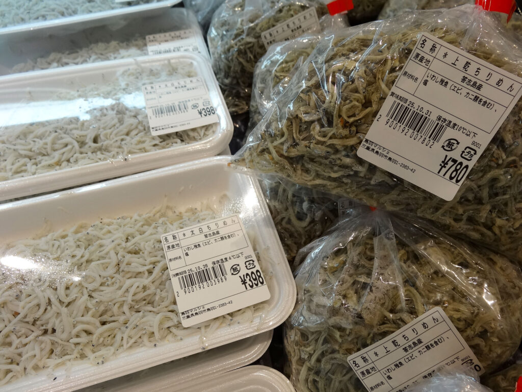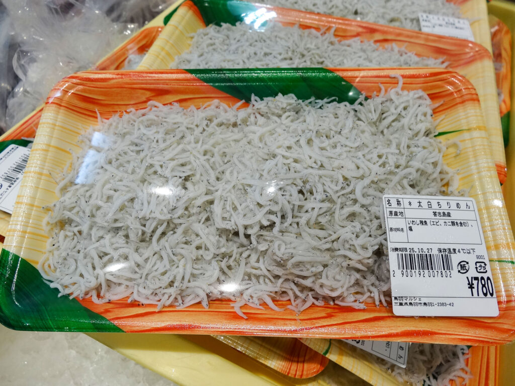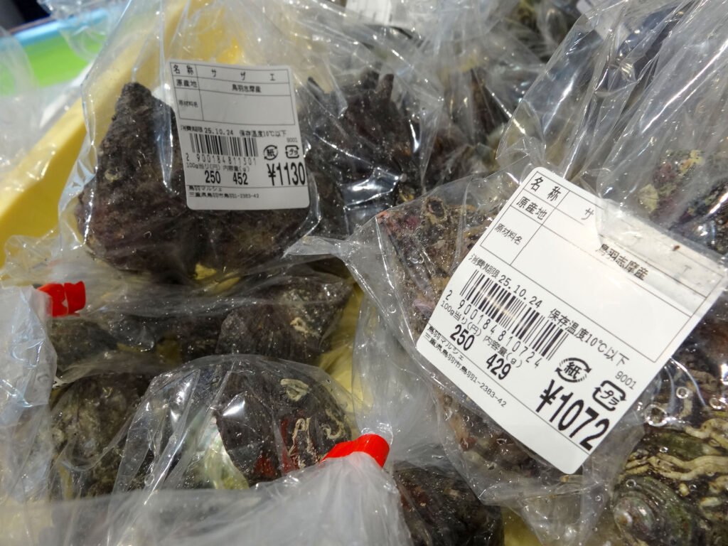 鮮魚コーナーでは、活伊勢海老やサザエ、お買い得な袋入りのお魚、ちりめん、サク、お造りなどを販売中🦐🐟