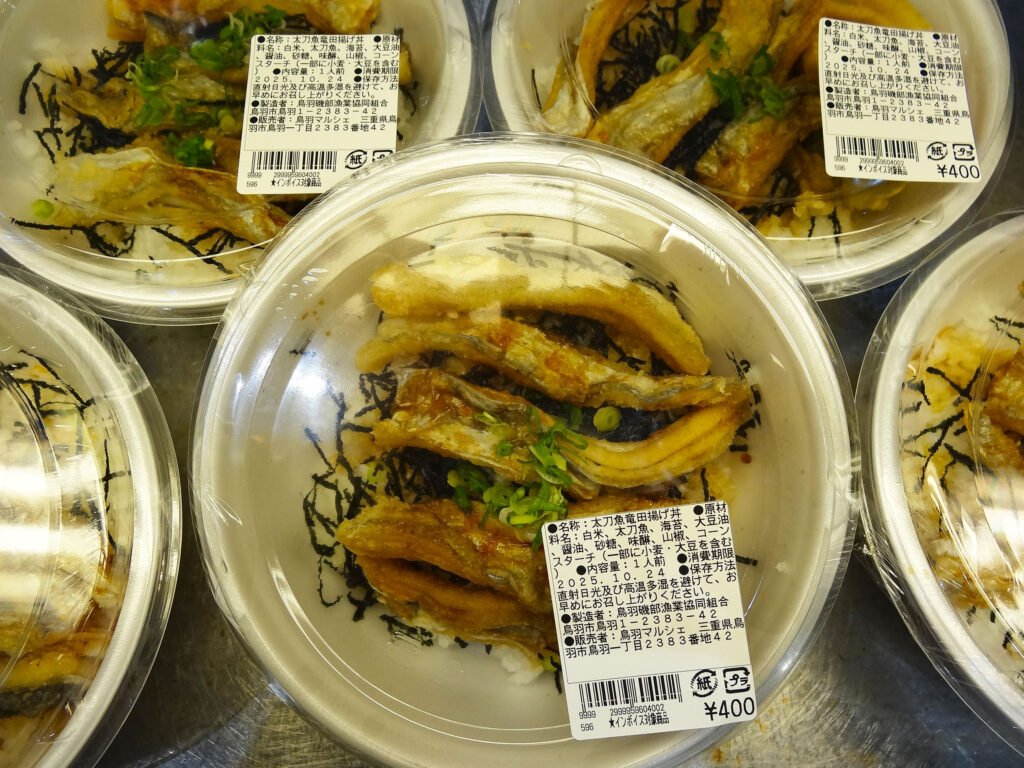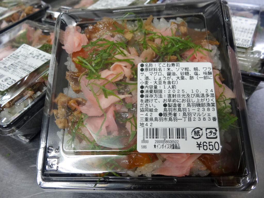 お弁当・お惣菜コーナーには、マルシェ日替わり弁当、てこね寿司、太刀魚の竜田揚げ丼白身魚の生姜酢などが並んでおります🍱🍚