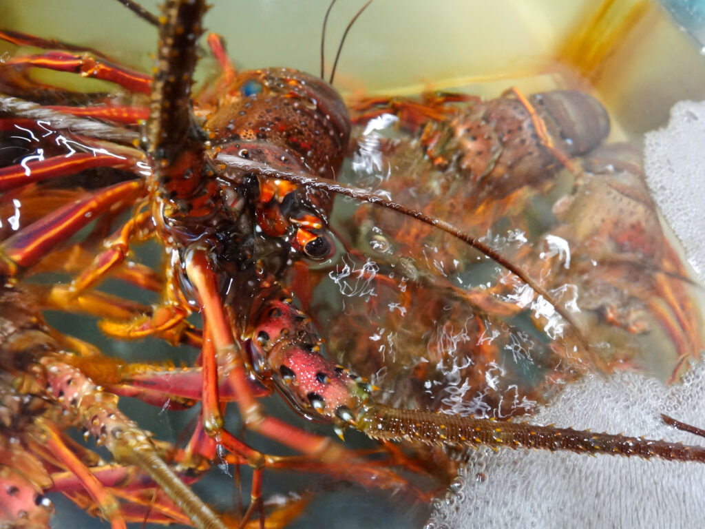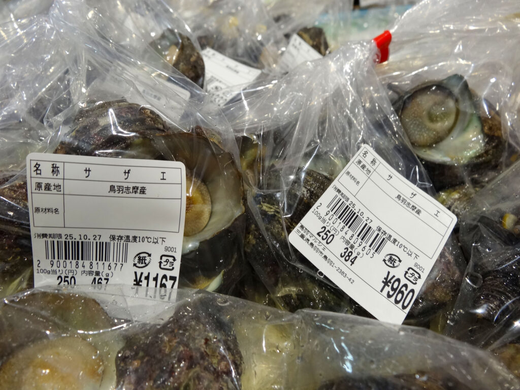 鮮魚コーナーでは、活伊勢海老にサザエ、お買い得な袋入りのお魚、ちりめん、サク、パック詰めのお魚、お造りなどを販売中🦐🐟