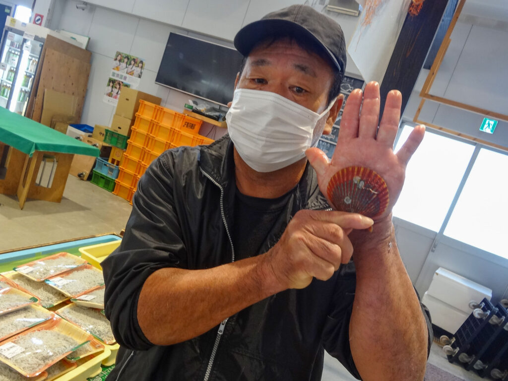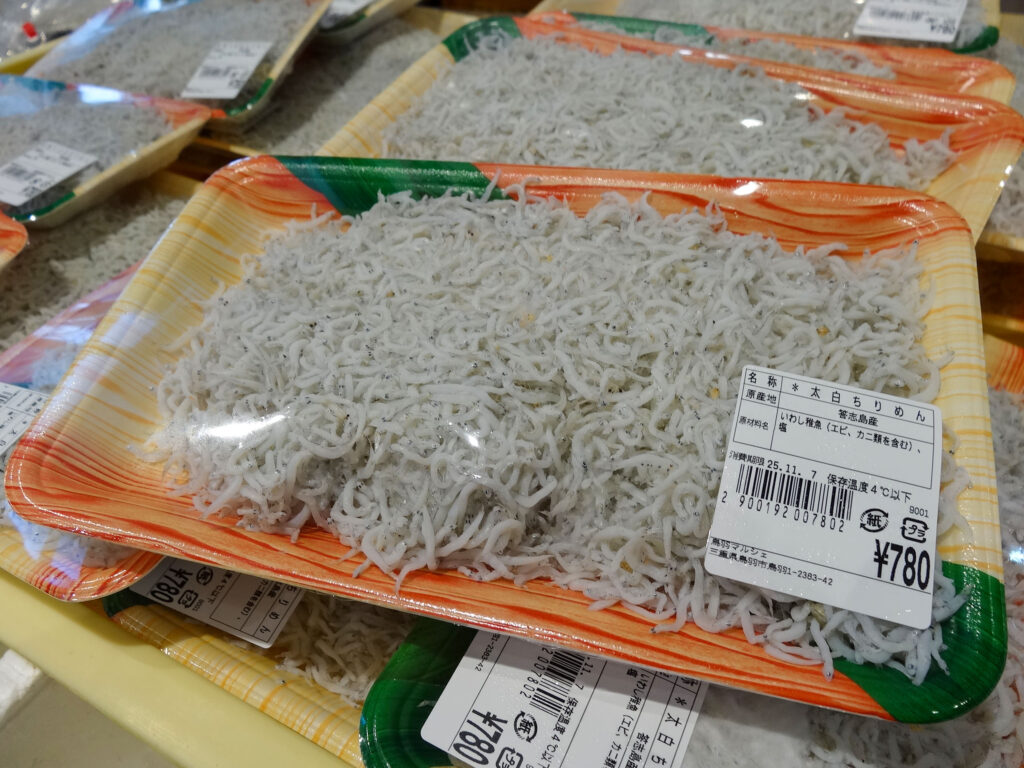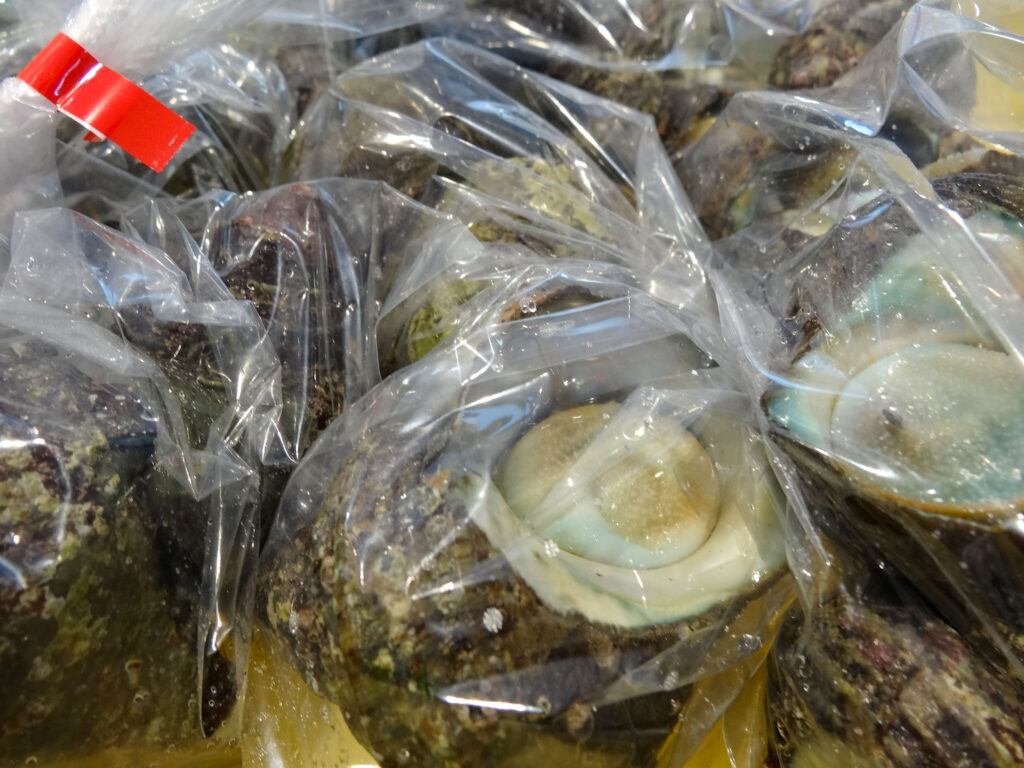 鮮魚コーナーでは、活伊勢海老やヒオウギ貝、サザエ、お買い得な袋入りのお魚や、サク、ちりめん、お造りなどを販売中🦐🐟