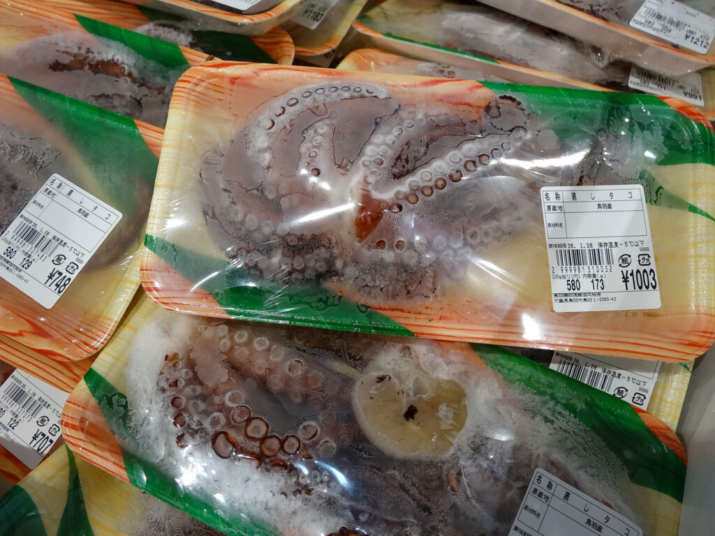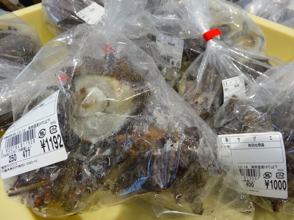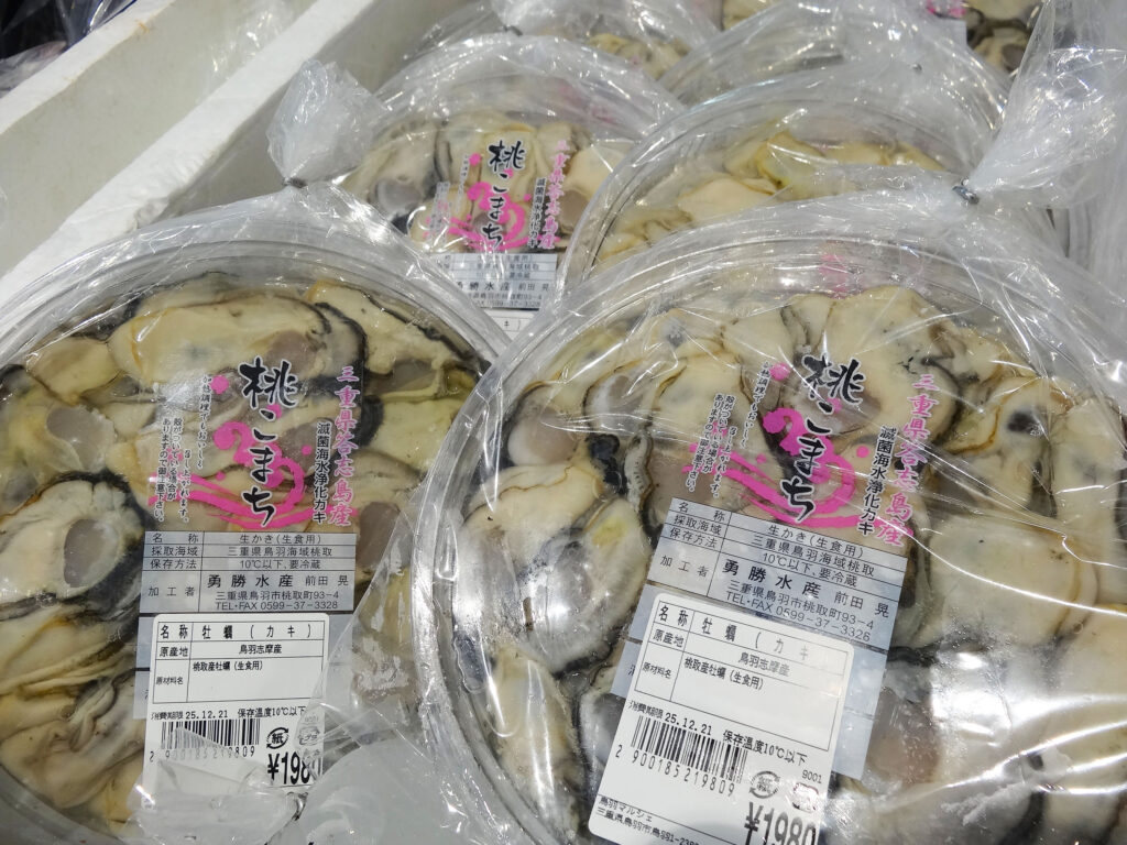 鮮魚コーナーでは、むき身牡蠣やサザエ、お買い得な袋入りのお魚、ちりめん、サク、お造り、冷凍の蒸しタコなどを販売中🦪🐟🐙