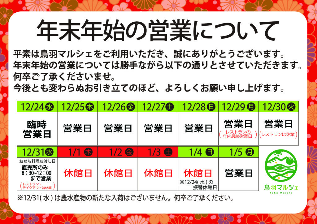 【年末年始の営業について】 今日のマルシェ 2025.12.22 平素は格別のお引立てを賜り誠にありがとうございます。さて、鳥羽マルシェでは年末年始の営業につきまして、下記のとおりとさせていただきます。 12月23日(火)は鳥羽めしレストラン営業いたします‼️皆様のご来店、お待ちしております^^