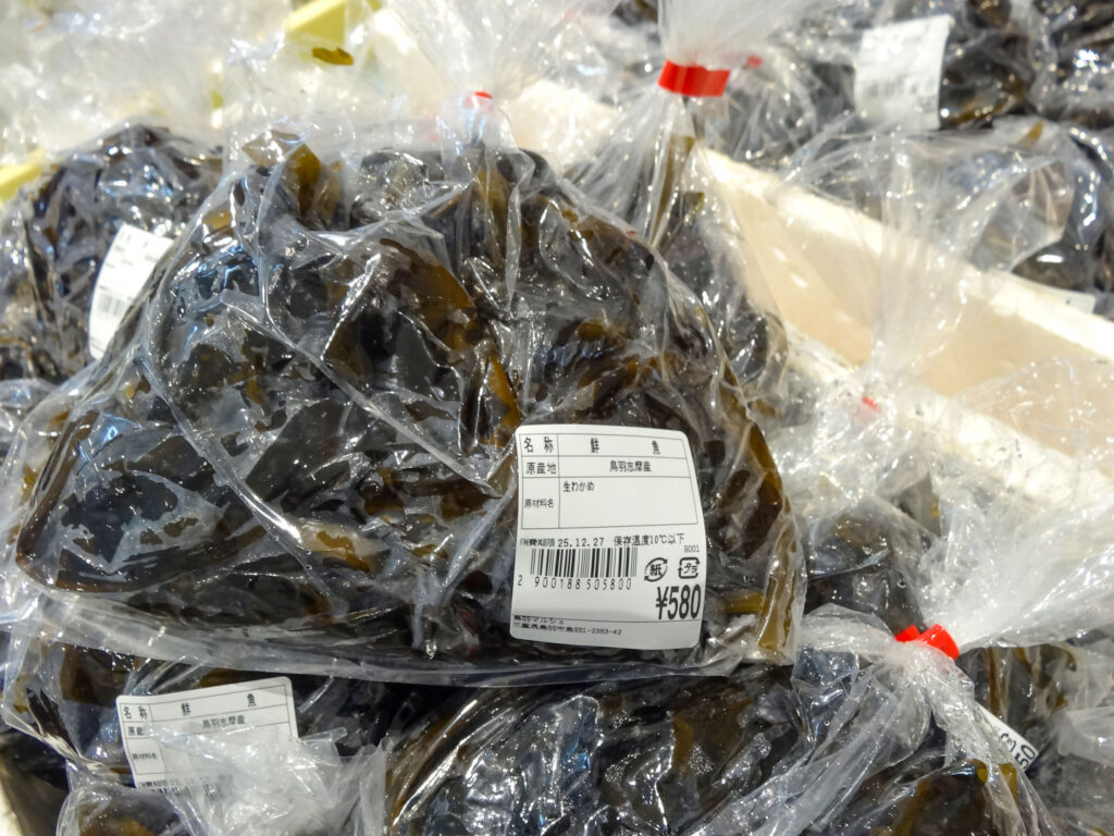 鮮魚コーナーには、生わかめ、セル牡蠣やむき身牡蠣、サザエ、お買い得な袋入りのお魚、ちりめん、サク、お造りなどを販売中🐟‼️