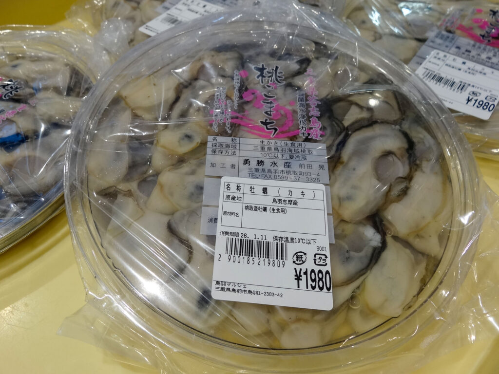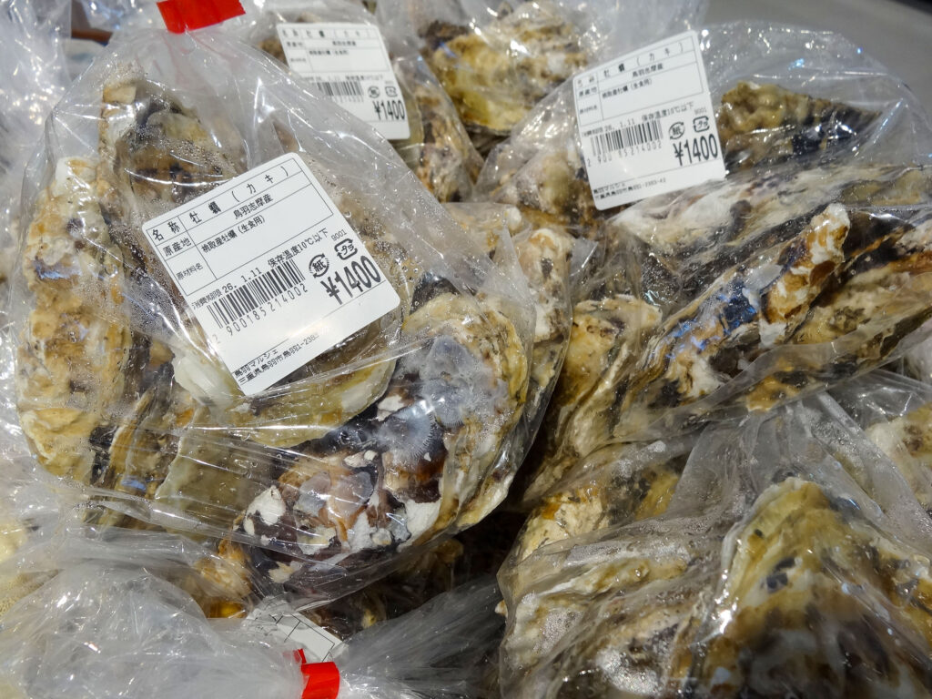 鮮魚コーナーでは、セル牡蠣、むき身牡蠣にサザエ、お買い得な袋入りのお魚、ちりめん、サク、お造りなどを販売中🦪🐟