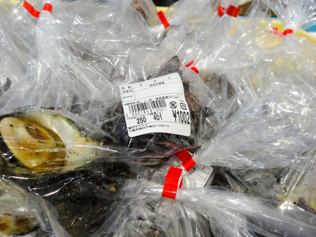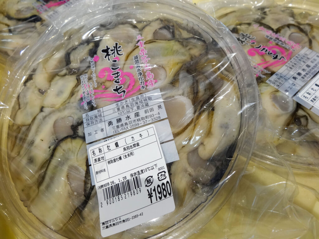鮮魚コーナーでは、牡蠣やサザエ、お買い得な袋入りのお魚、ちりめん、パック詰めのお魚にサク、お造り、冷凍の伊勢海老などを販売中🦪🐟🦐