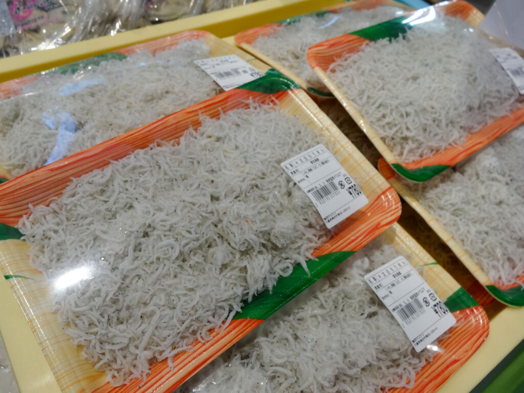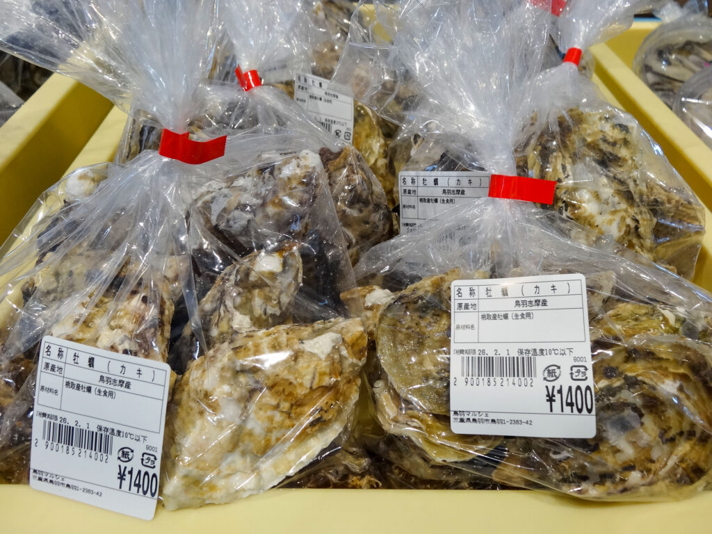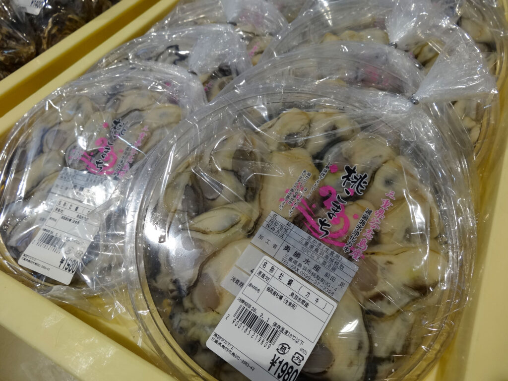 鮮魚コーナーでは、牡蠣にサザエ、ちりめん、パック詰めのお魚、サク、お造りなどを販売中🦪🐟