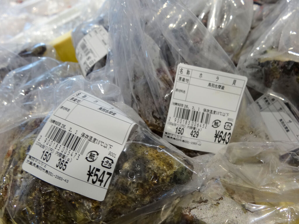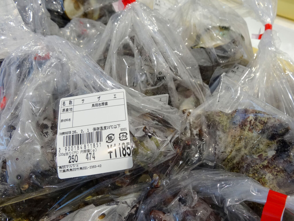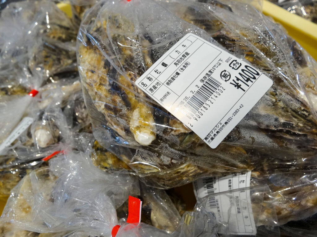 鮮魚コーナーでは、牡蠣やサザエ、ホラ貝、お買い得な袋入りのお魚、パック詰めのお魚にサク、お造りなどを販売中🦪🐚