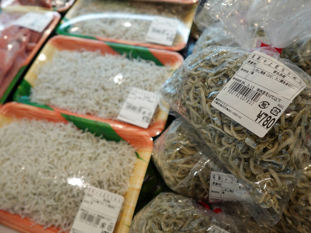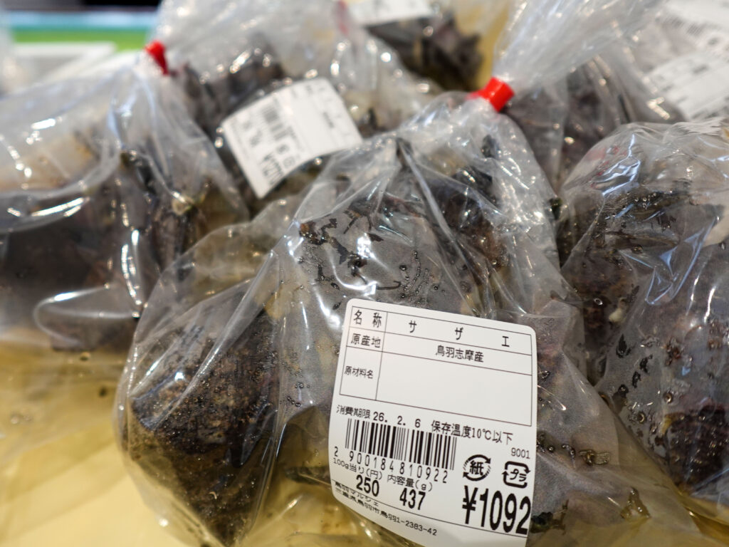 鮮魚コーナーでは、牡蠣にサザエ、ちりめん、お買い得な袋入りのお魚、サク、お造りなどを販売中🦪🐟