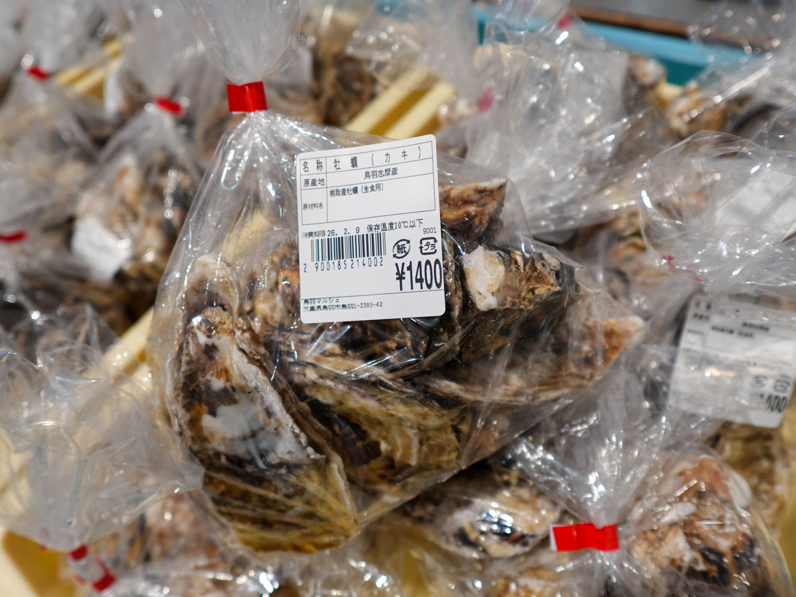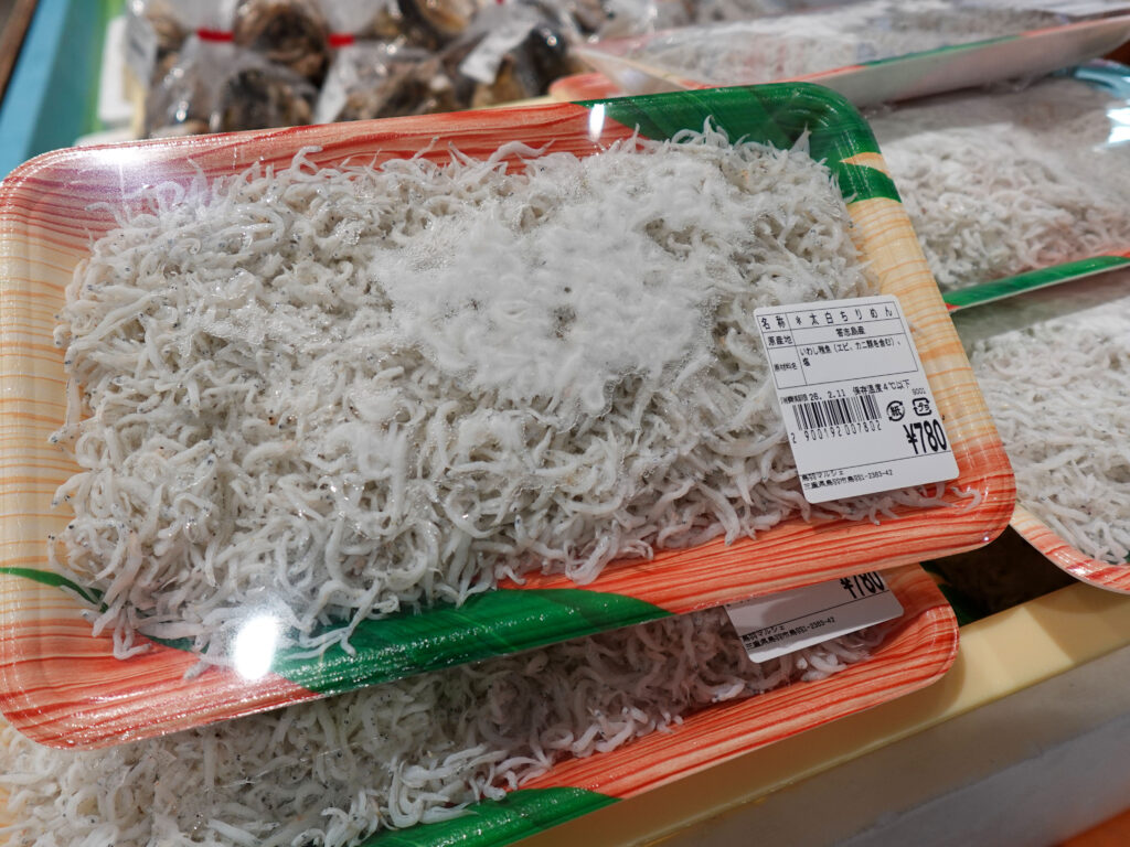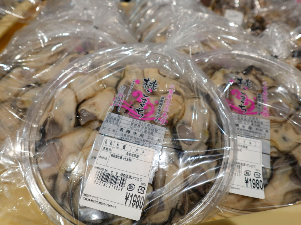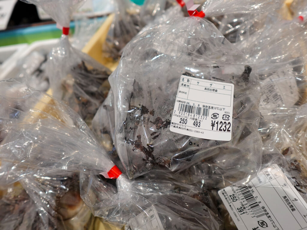 鮮魚コーナーでは、牡蠣やサザエ、お買い得な袋入りのお魚、ちりめん、パック詰めのお魚にサク、お造りなどを販売中🦪🐟