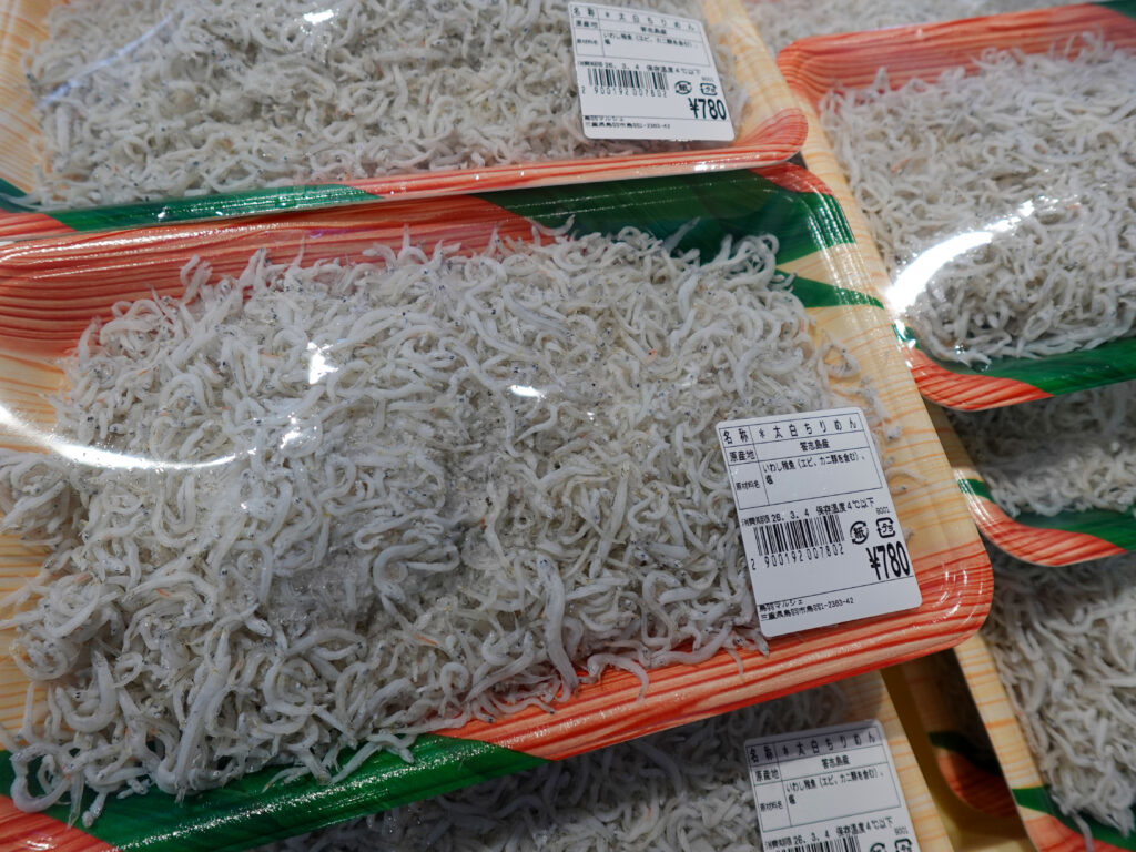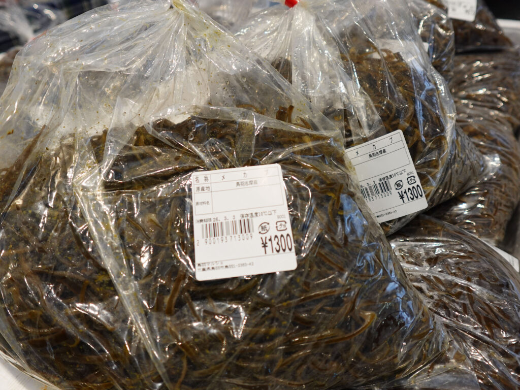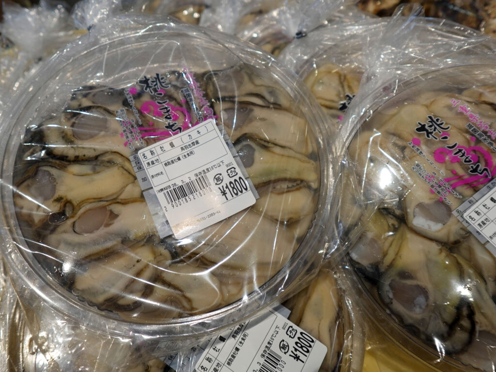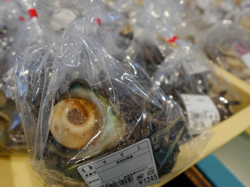 鮮魚コーナーでは、牡蠣やサザエ、お買い得な袋入りのお魚、パック詰めのお魚、ちりめん、サク、お造り、刻みメカブなどが並んでおります🦪🐟