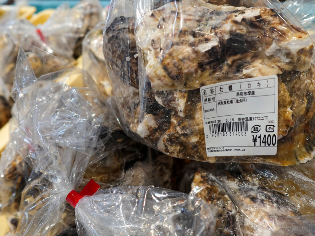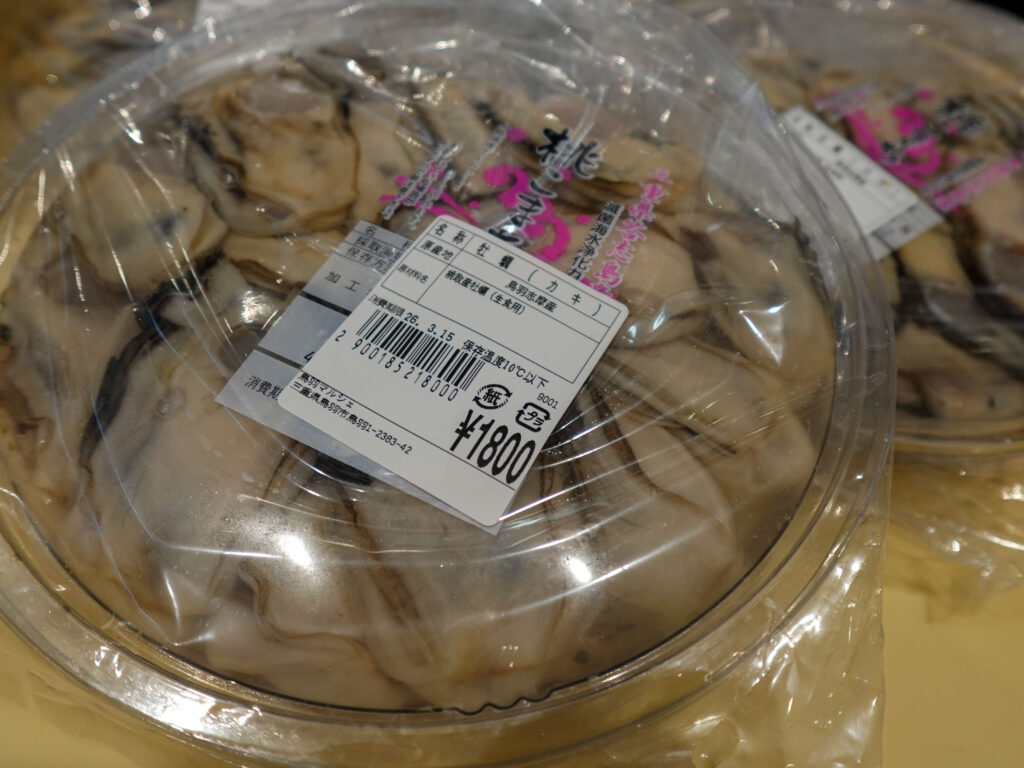 鮮魚コーナーでは、牡蠣、サザエ、お買い得な袋入りのお魚、ちりめん、サク、パック詰めのお魚、お造りなど販売しております🦪🐟