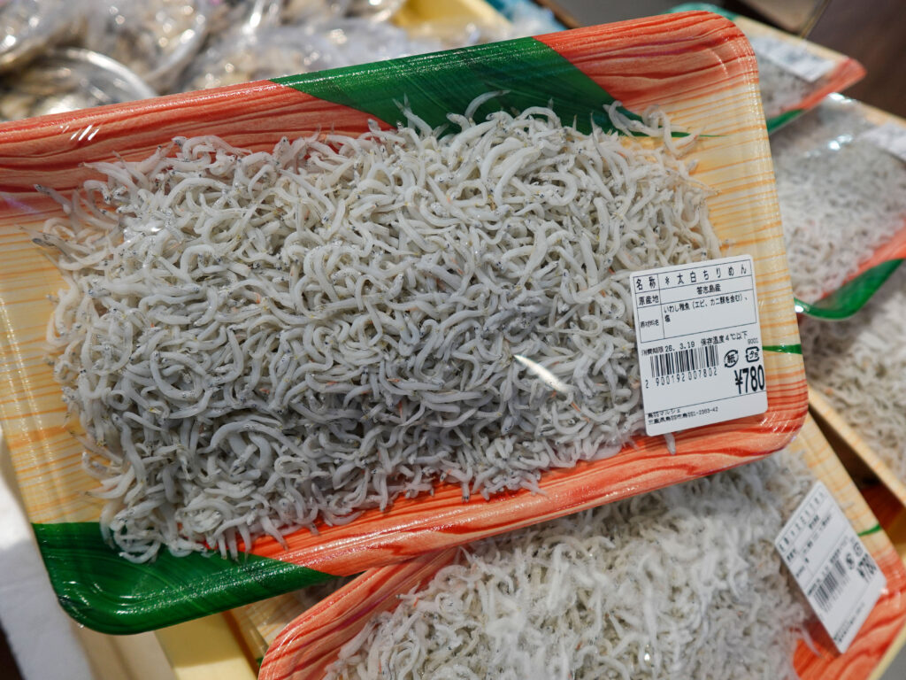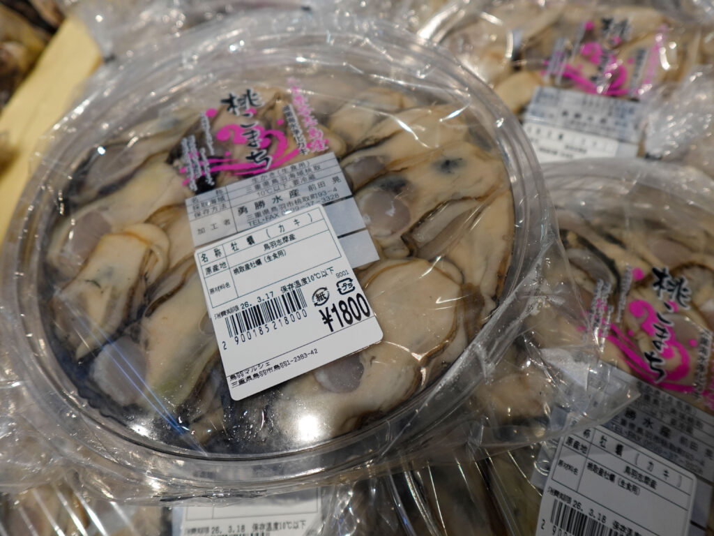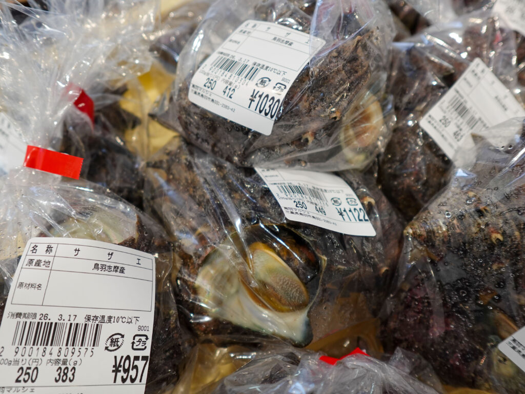 鮮魚コーナーでは、牡蠣やサザエ、イカやホウボウなどのお買い得な袋入りのお魚、ちりめん、サク、お造りなどを販売中‼️
