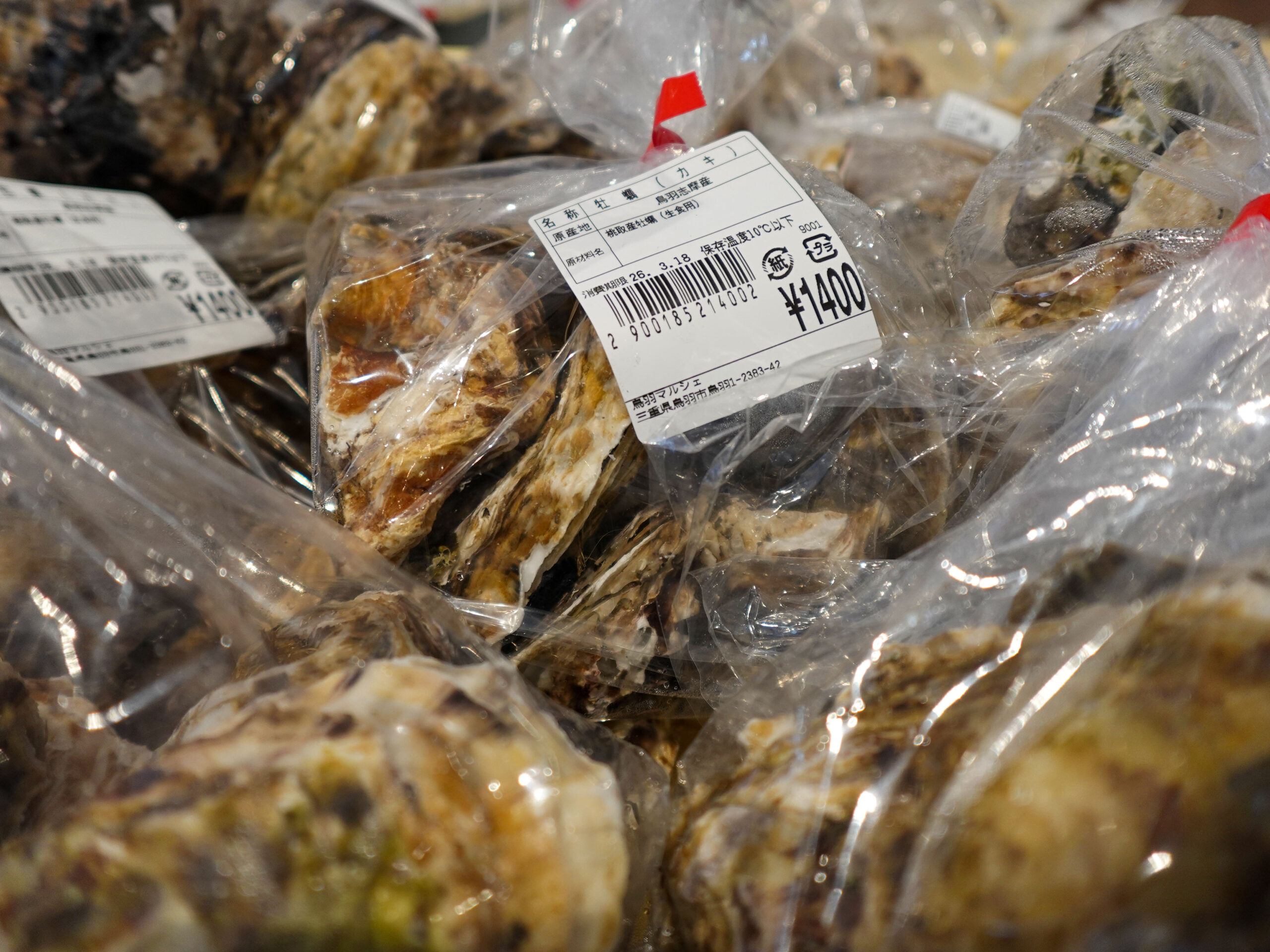 鮮魚コーナーでは、牡蠣やサザエ、イカやホウボウなどのお買い得な袋入りのお魚、ちりめん、サク、お造りなどを販売中‼️
