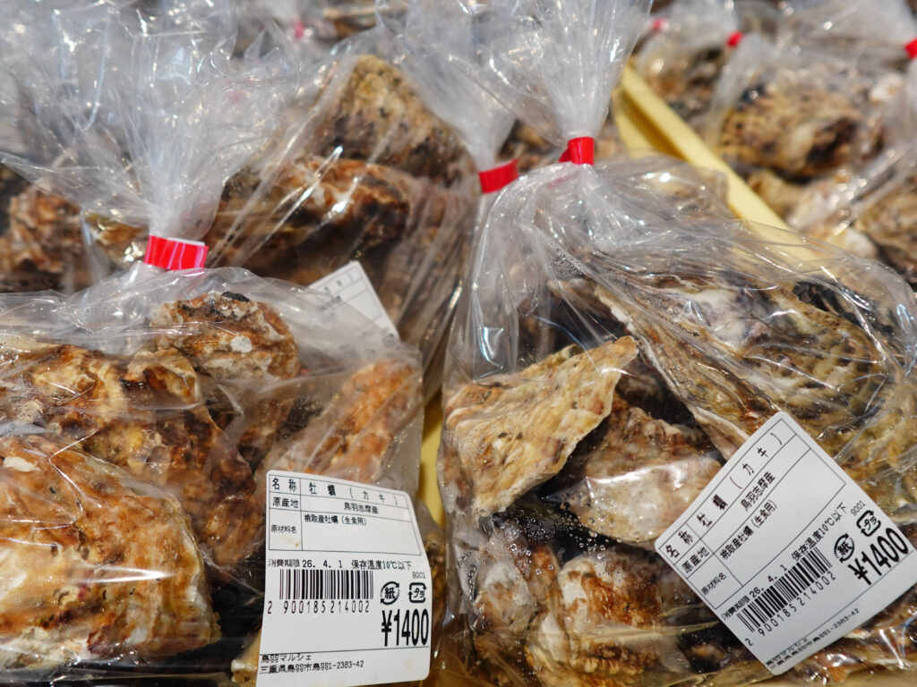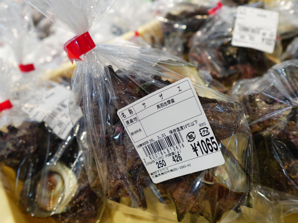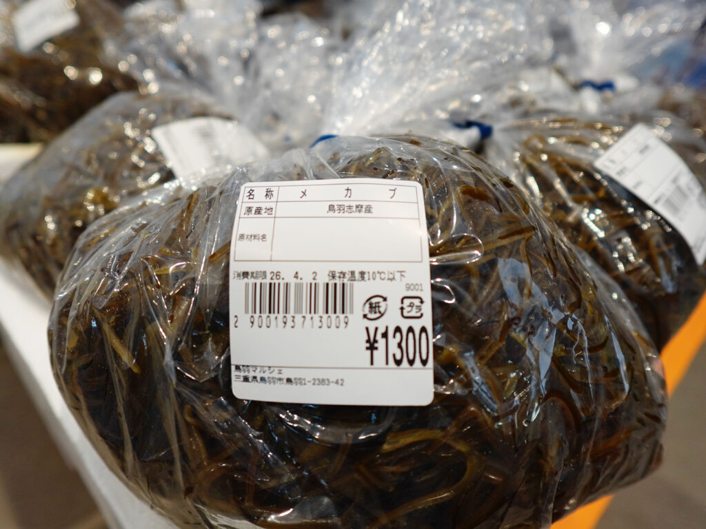 鮮魚コーナーでは、刻みメカブ、牡蠣やサザエ、マダイなどのお買い得な袋入りのお魚、パック詰めのお魚にサク、お造りなどを販売中🦪🐟