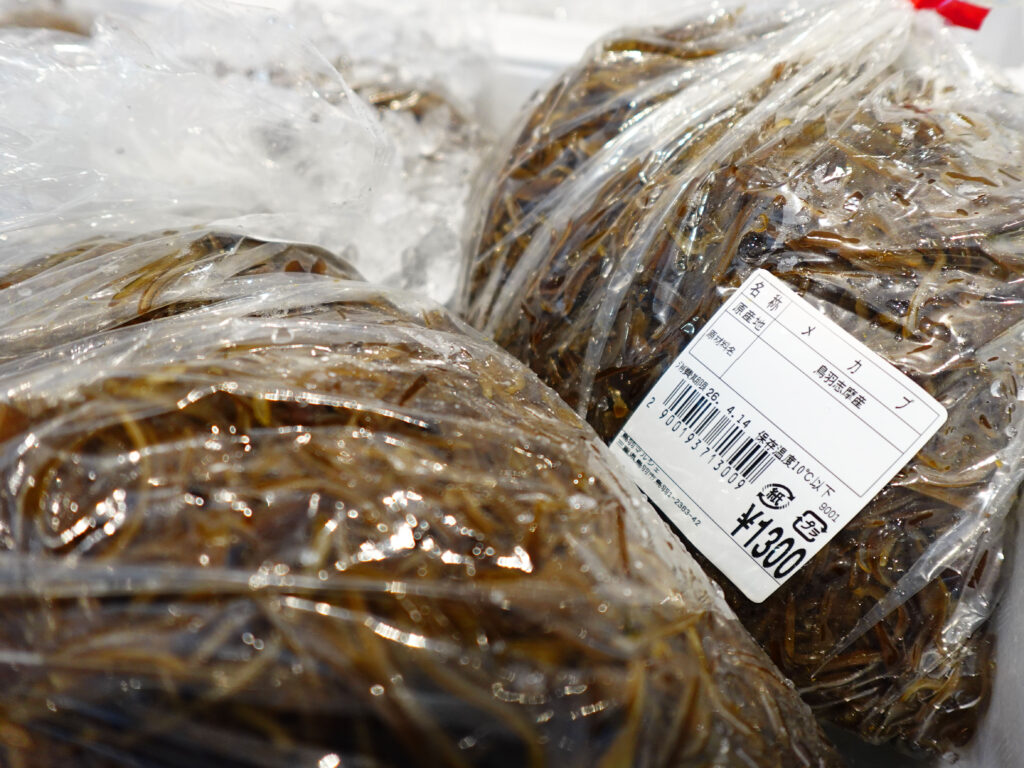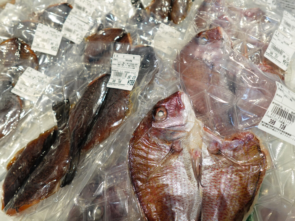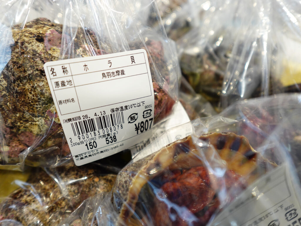鮮魚コーナーでは、刻みメカブ、牡蠣やホラ貝、サザエ、パック詰めのお魚、冷凍の干物にサク、お造りなどを販売中🦪🐟