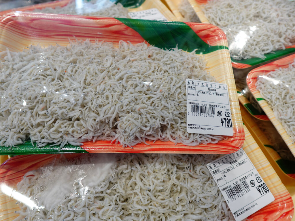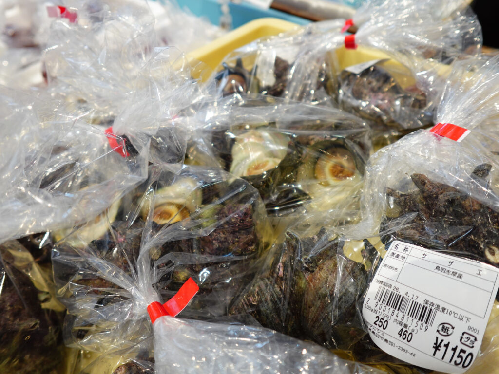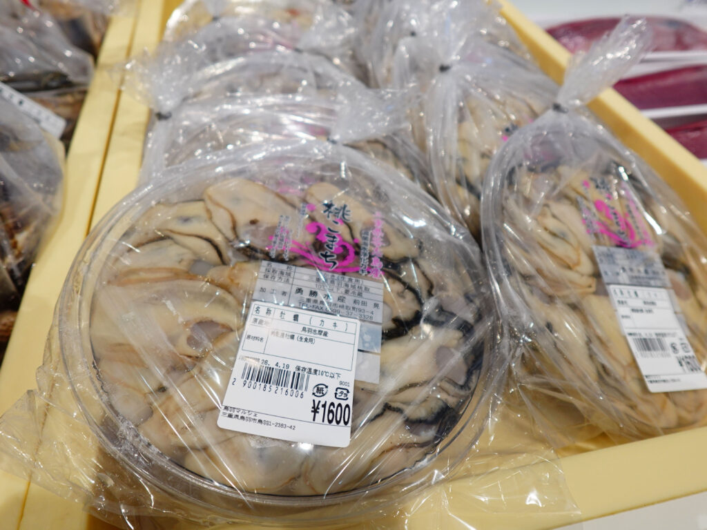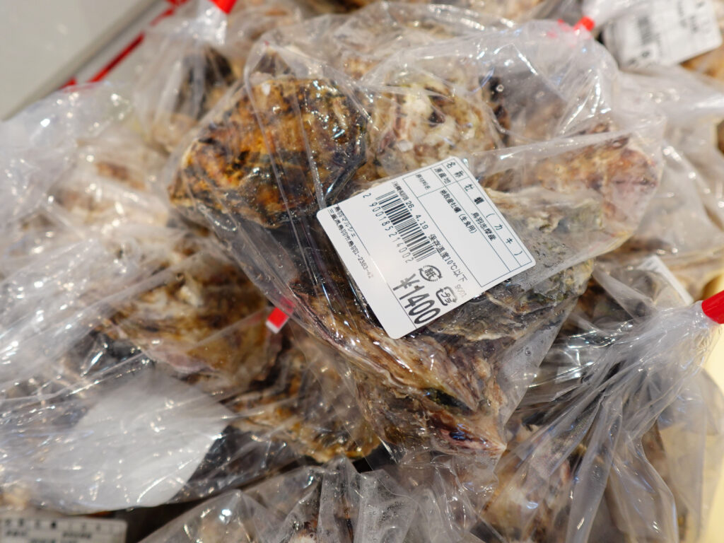 鮮魚コーナーでは、牡蠣やサザエ、マダイやイカなどのお買い得な袋入りのお魚、ちりめん、カツオなどのサク、お造りなどを販売しております🦪🐟