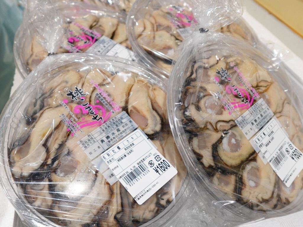 鮮魚コーナーでは、牡蠣やサザエ、お買い得な袋入りのお魚、サク、お造りなどを販売中🦪🐟