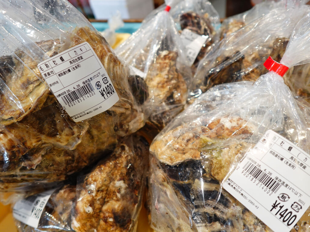 鮮魚コーナーでは、牡蠣やサザエ、お買い得な袋入りのお魚、カツオなどのサク、お造りなどを販売中🦪🐟