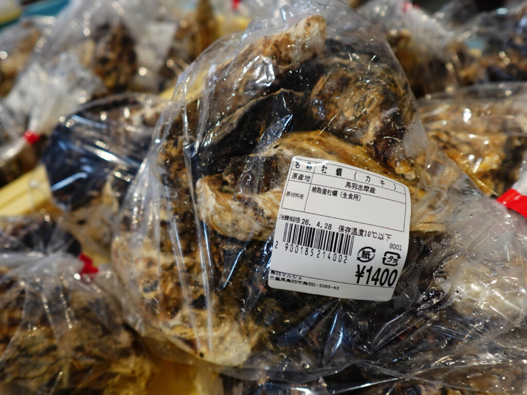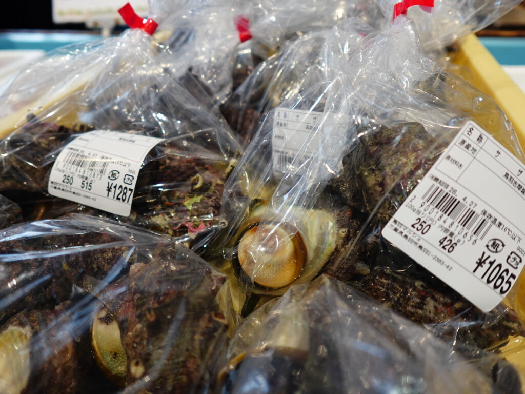 鮮魚コーナーでは、牡蠣、サザエ、マダイやグレなどのお買い得な袋入りのお魚、ちりめん、サク、パック詰めのお魚にお造りなどを販売中🦪🐟